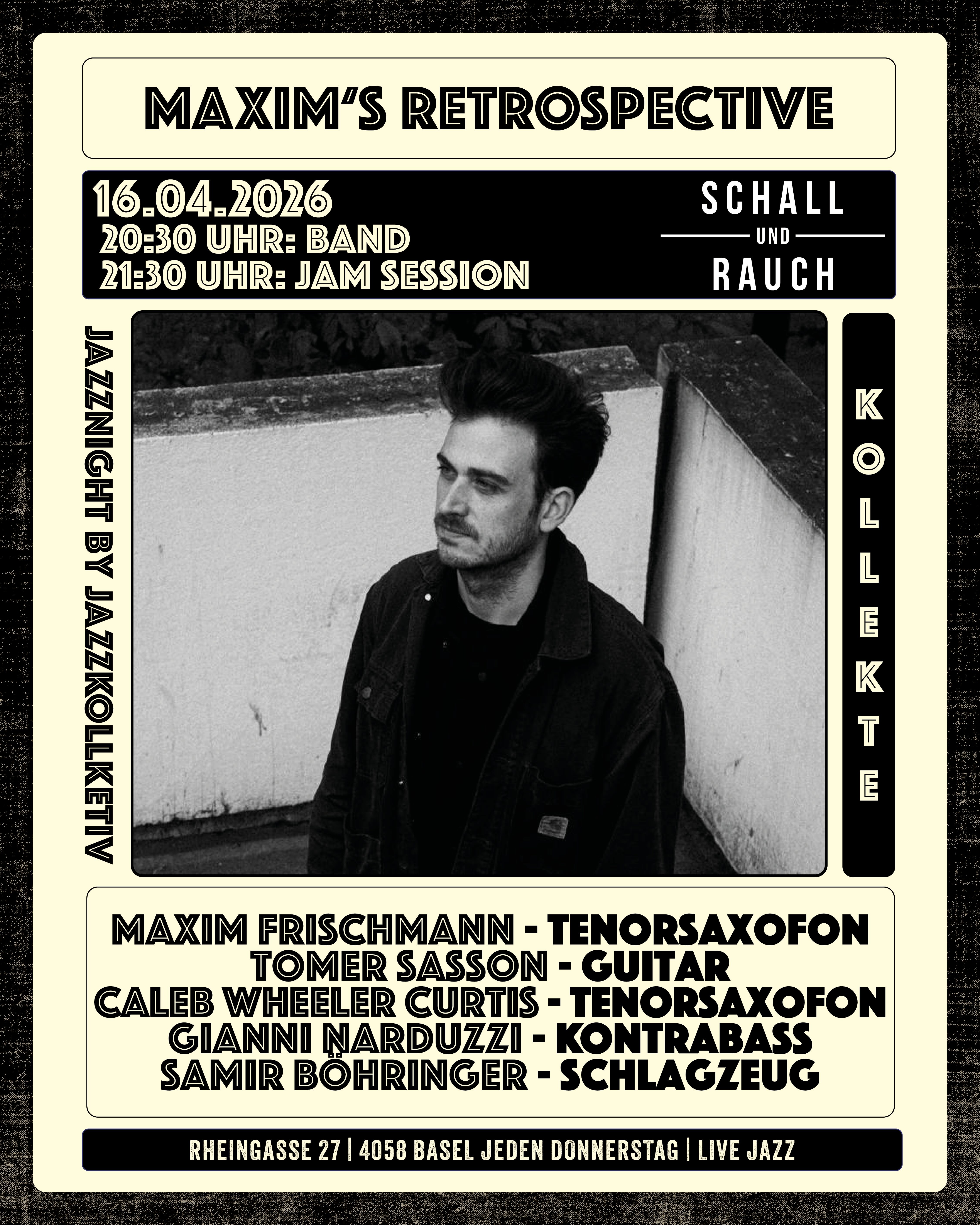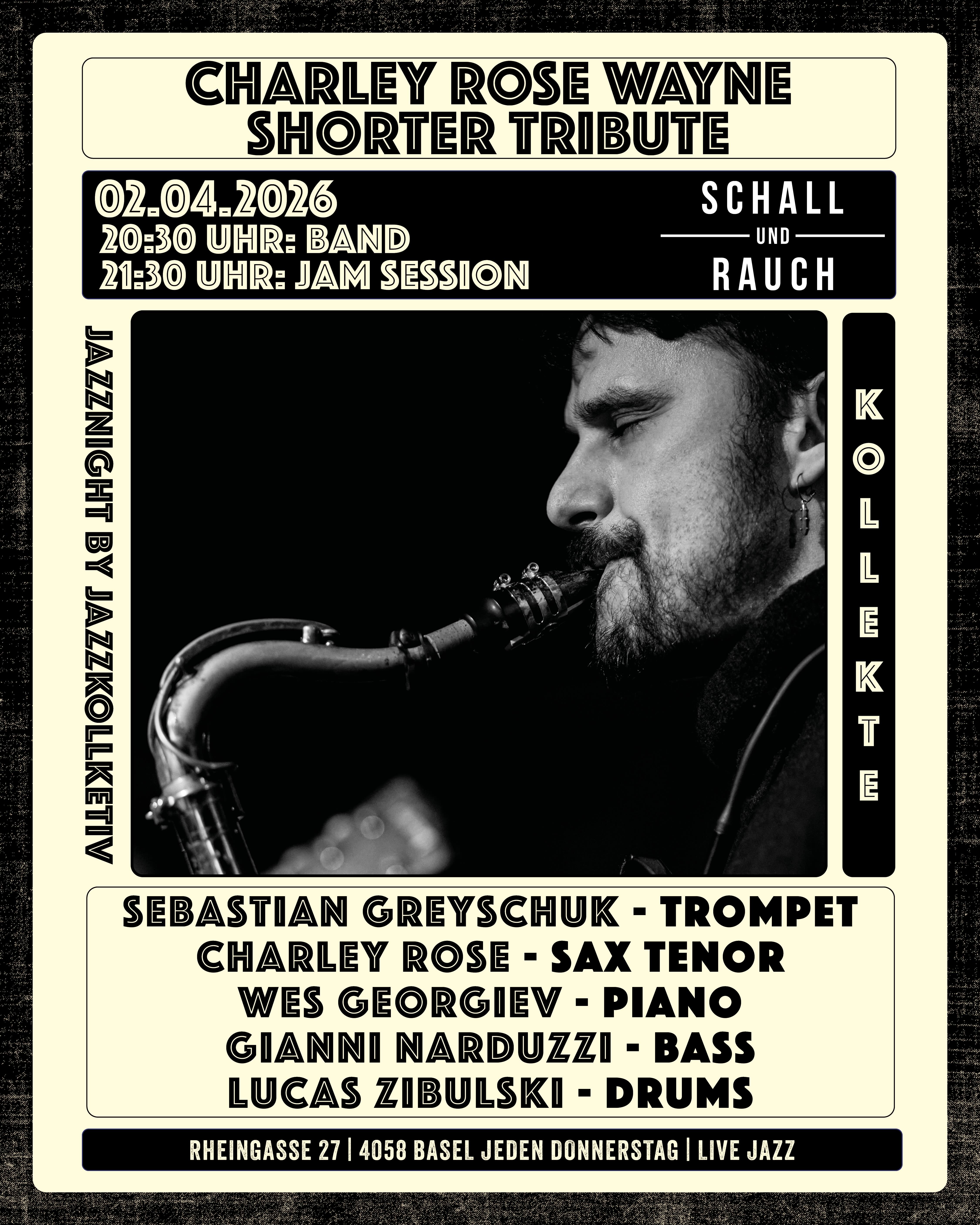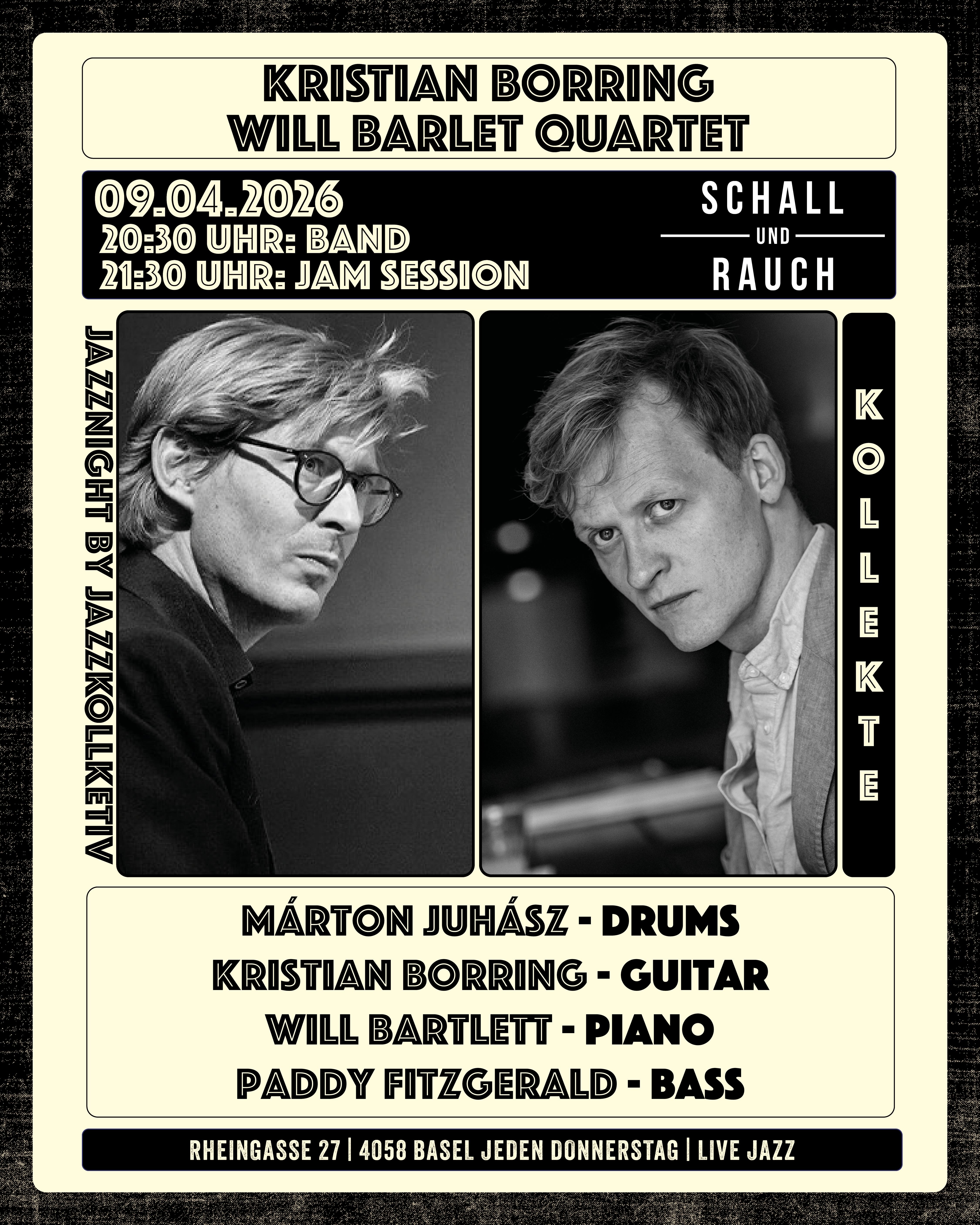 Um 20:30 Uhr spielt eine Opening Band, anschliessend beginnt die Jam Session für die Basler Jazz Szene.