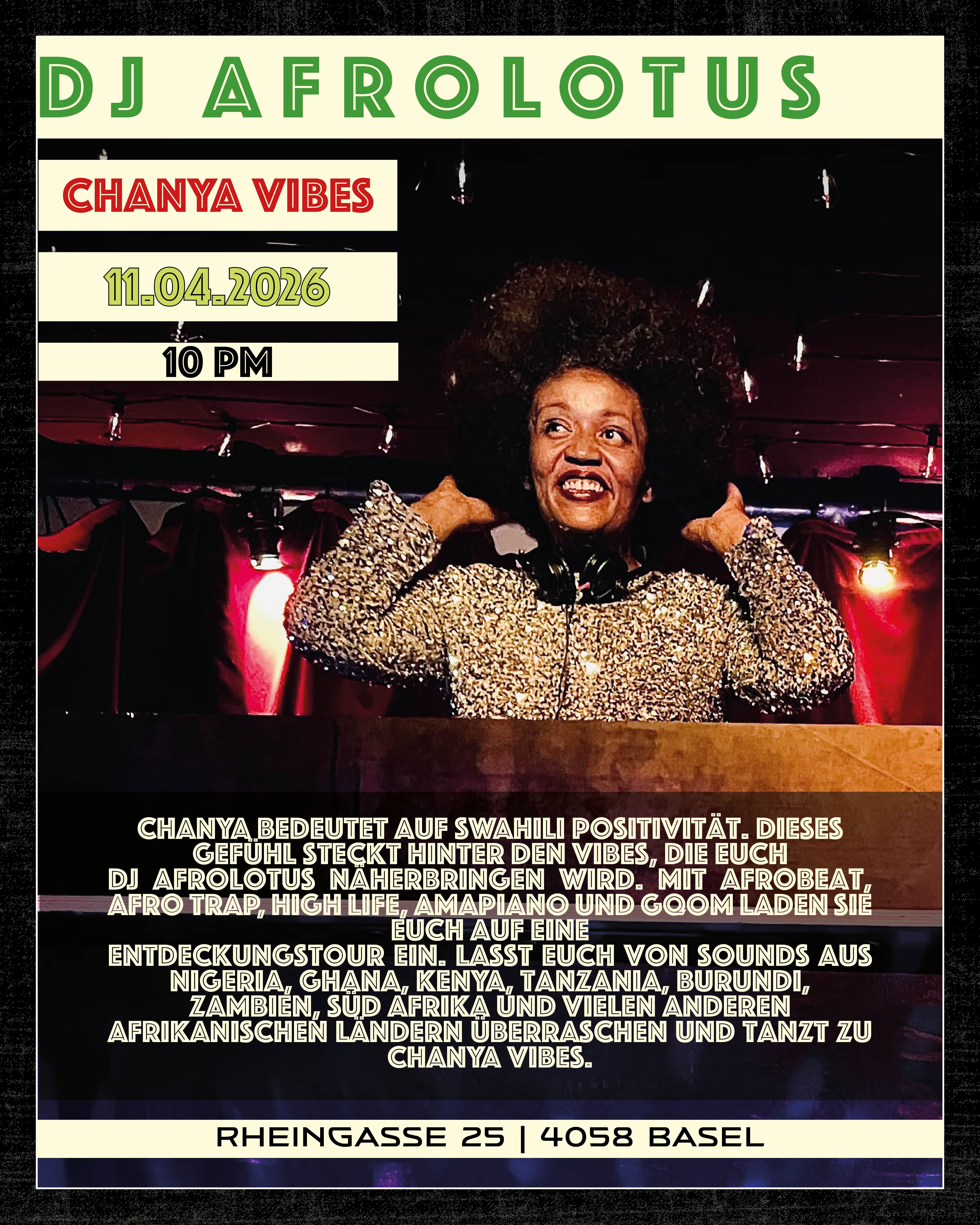 Chanya bedeutet auf Swahili Positivität. Dieses Gefühl steckt hinter den Vibes, die euch DJ AfroLotus näherbringen wird. Mit Afrobeat, Afro Trap, High Life, Amapiano und Gqom laden sie euch auf eine Entdeckungstour ein. Lasst euch von Sounds aus Nigeria, Ghana, Kenya, Tanzania, Burundi, Zambien, Süd Afrika und vielen anderen Afrikanischen Ländern überraschen und tanzt zu Chanya Vibes.