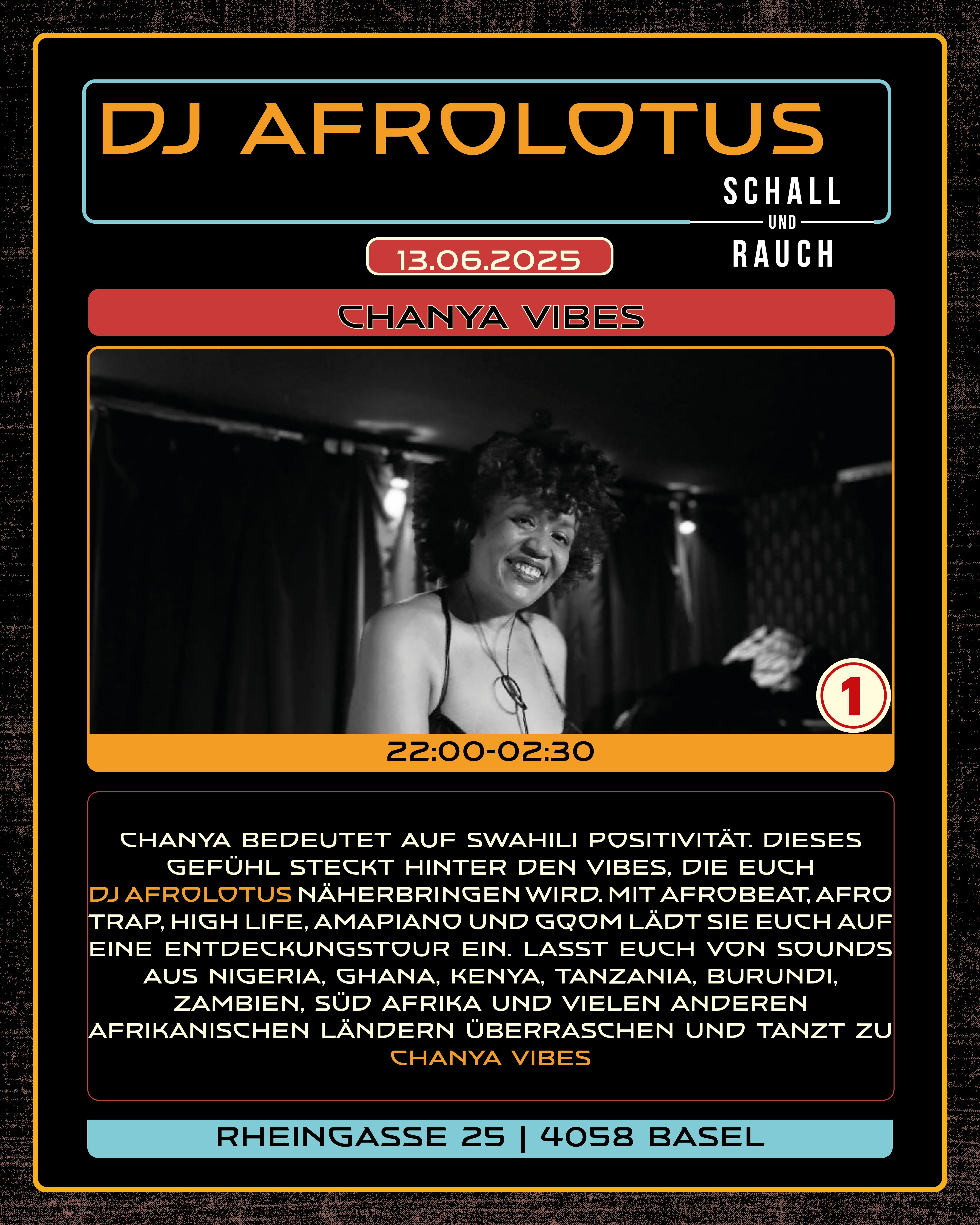 Chanya bedeutet auf Swahili Positivität. Dieses Gefühl steckt hinter den Vibes, die euch DJ AfroLotus näherbringen wird. Mit Afrobeat, Afro Trap, High Life, Amapiano und Gqom laden sie euch auf eine Entdeckungstour ein. Lasst euch von Sounds aus Nigeria, Ghana, Kenya, Tanzania, Burundi, Zambien, Süd Afrika und vielen anderen Afrikanischen Ländern überraschen und tanzt zu Chanya Vibes.