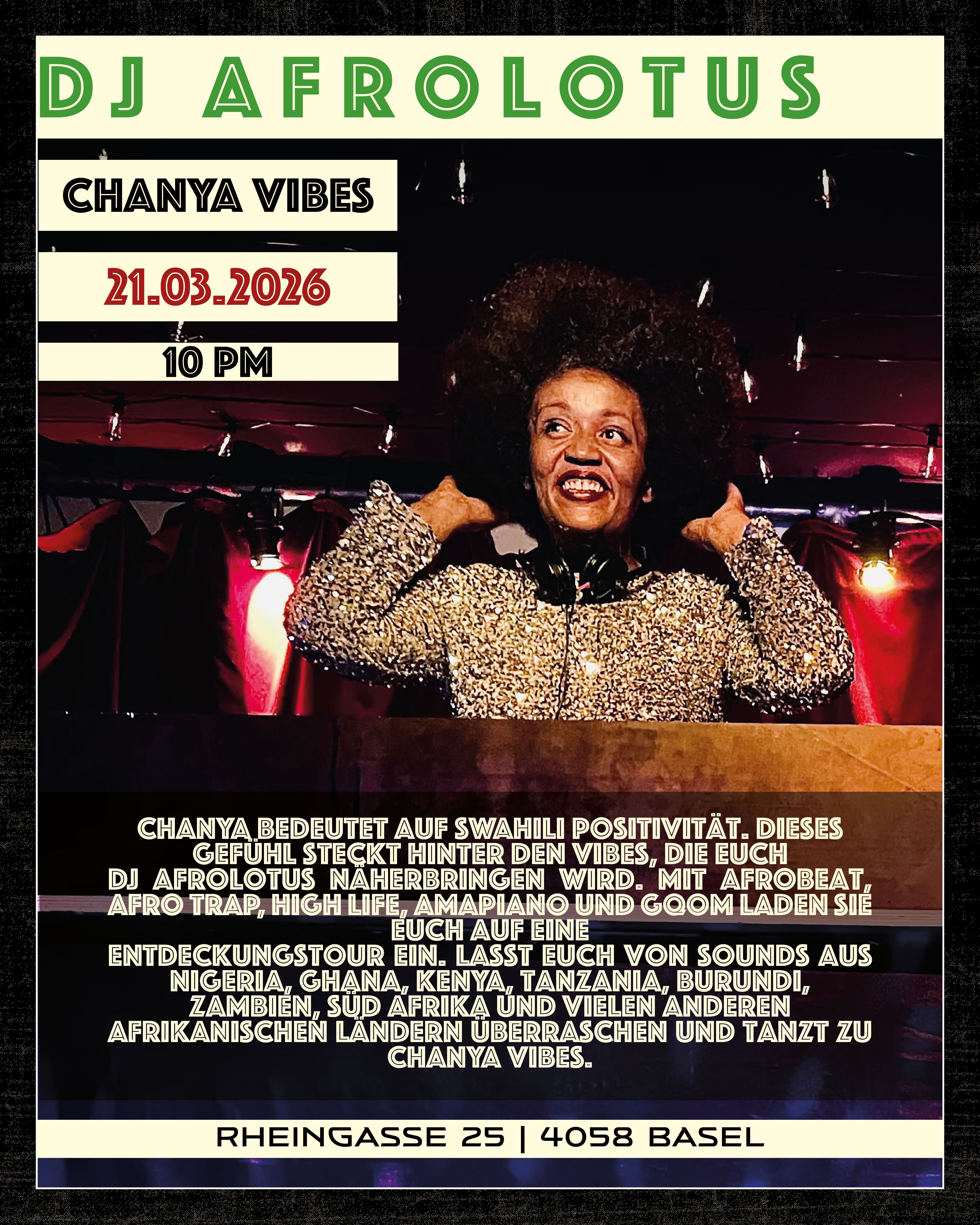 Chanya bedeutet auf Swahili Positivität. Dieses Gefühl steckt hinter den Vibes, die euch DJ AfroLotus näherbringen wird. Mit Afrobeat, Afro Trap, High Life, Amapiano und Gqom laden sie euch auf eine Entdeckungstour ein. Lasst euch von Sounds aus Nigeria, Ghana, Kenya, Tanzania, Burundi, Zambien, Süd Afrika und vielen anderen Afrikanischen Ländern überraschen und tanzt zu Chanya Vibes.