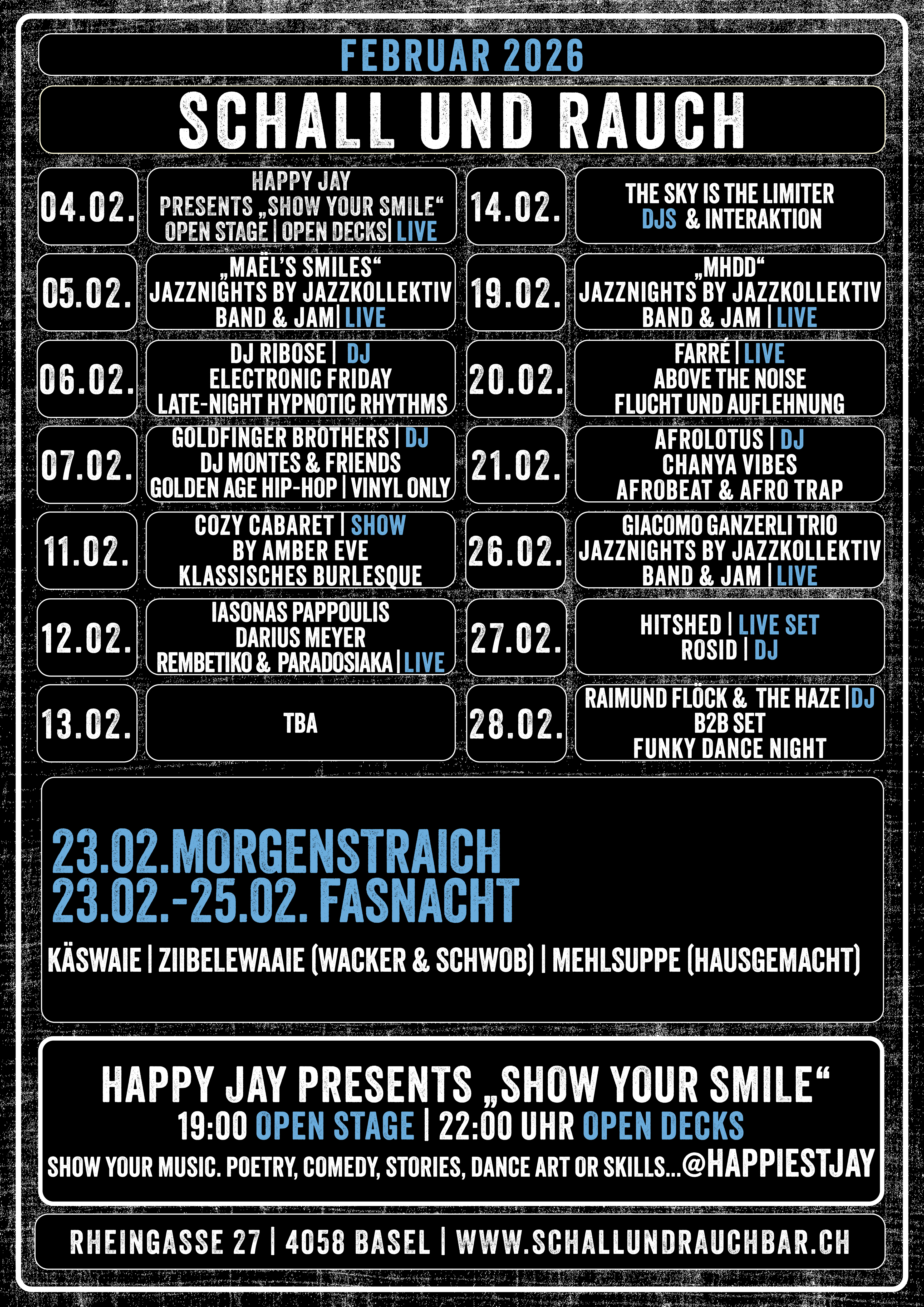 Gestartet wird mit einem Opener-Konzert, gefolgt von der Jamsession, bei der alle Musiker:innen, MC’s und Sänger:innen eingeladen sind. Der Abend bietet einen kreativen Ort für alle etablierten wie auch up and coming Artists.