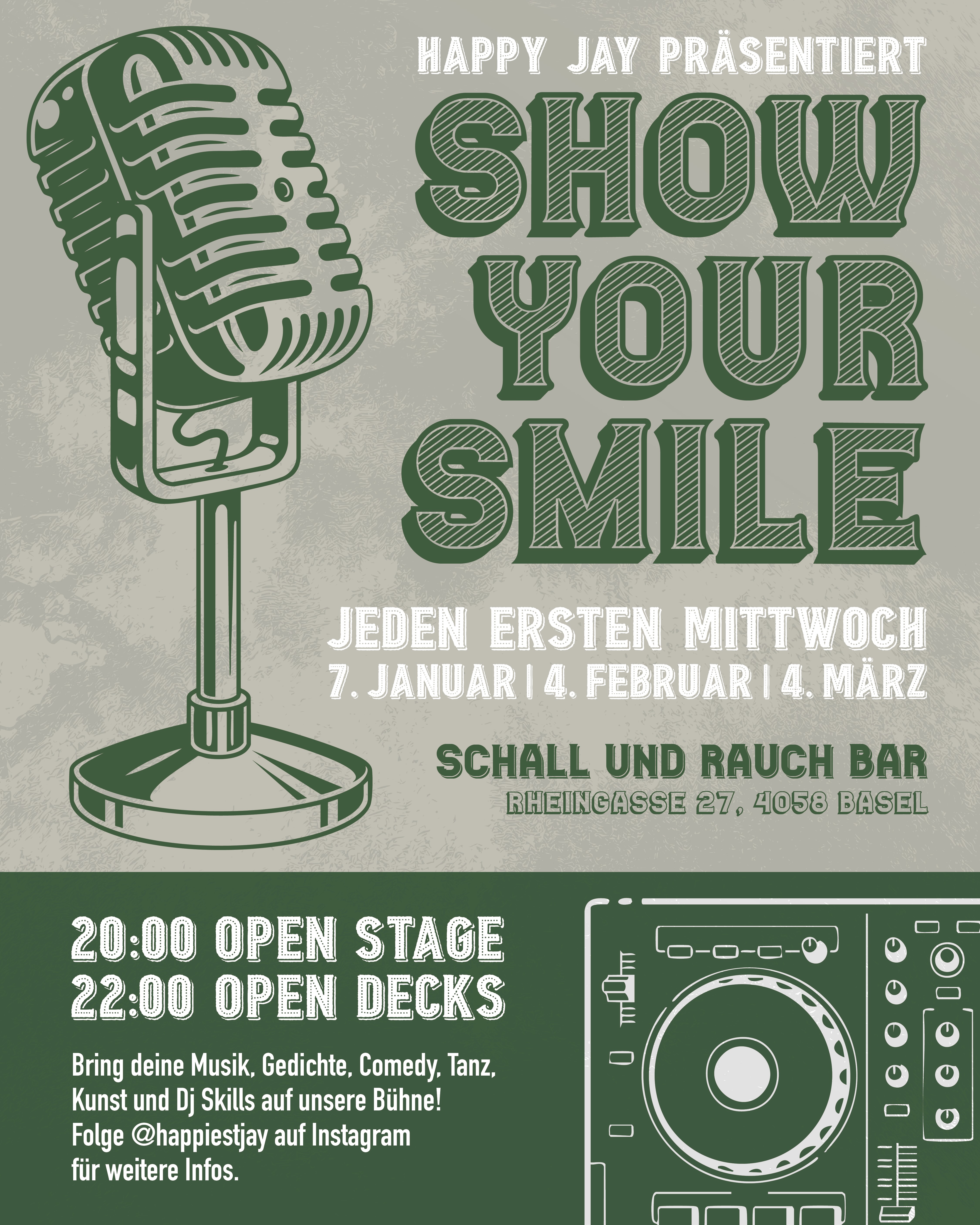 07.01.2026 | OPEN STAGE | OPEN DECKS (LIVE) OPEN STAGE | OPEN DECKS (LIVE) 19:00 OPEN STAGE22:00 OPEN DECKS HAPPY JAY PRESENTSSHOW YOUR SMILE Show your music, poetry, comedy, stories, dance, art or dj skills...Show us your passion!