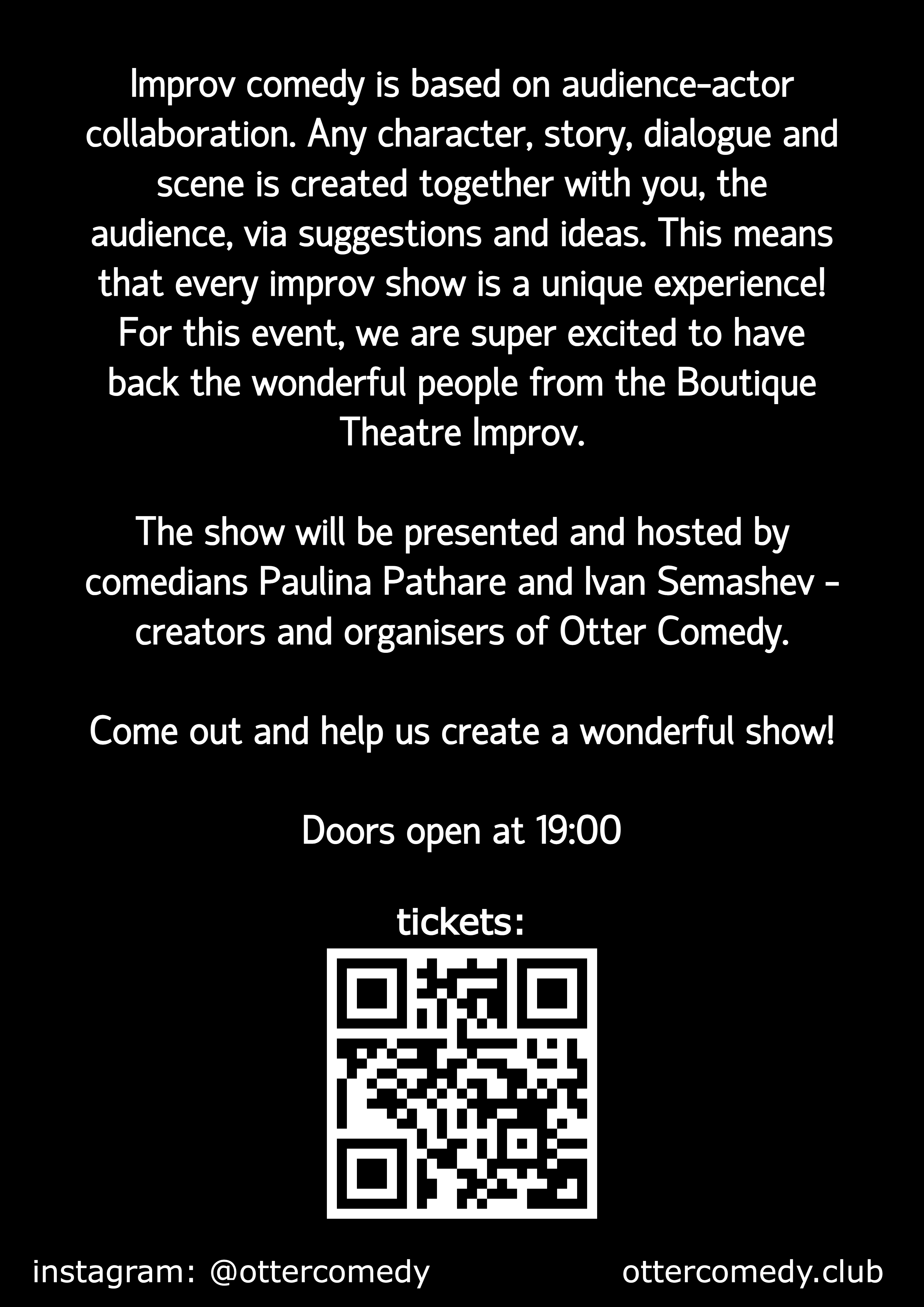 Join in for a hilariously unscripted evening of improvisational comedy! Here, YOU decide what happens on stage. Improv comedy is based on audience-actor collaboration. Any character, story, dialogue and scene is created together with you, the audience, via suggestions and ideas. This means that every improv show is a unique experience! For this event, we are super excited to have back the wonderful people from the Boutique Theatre Improv.