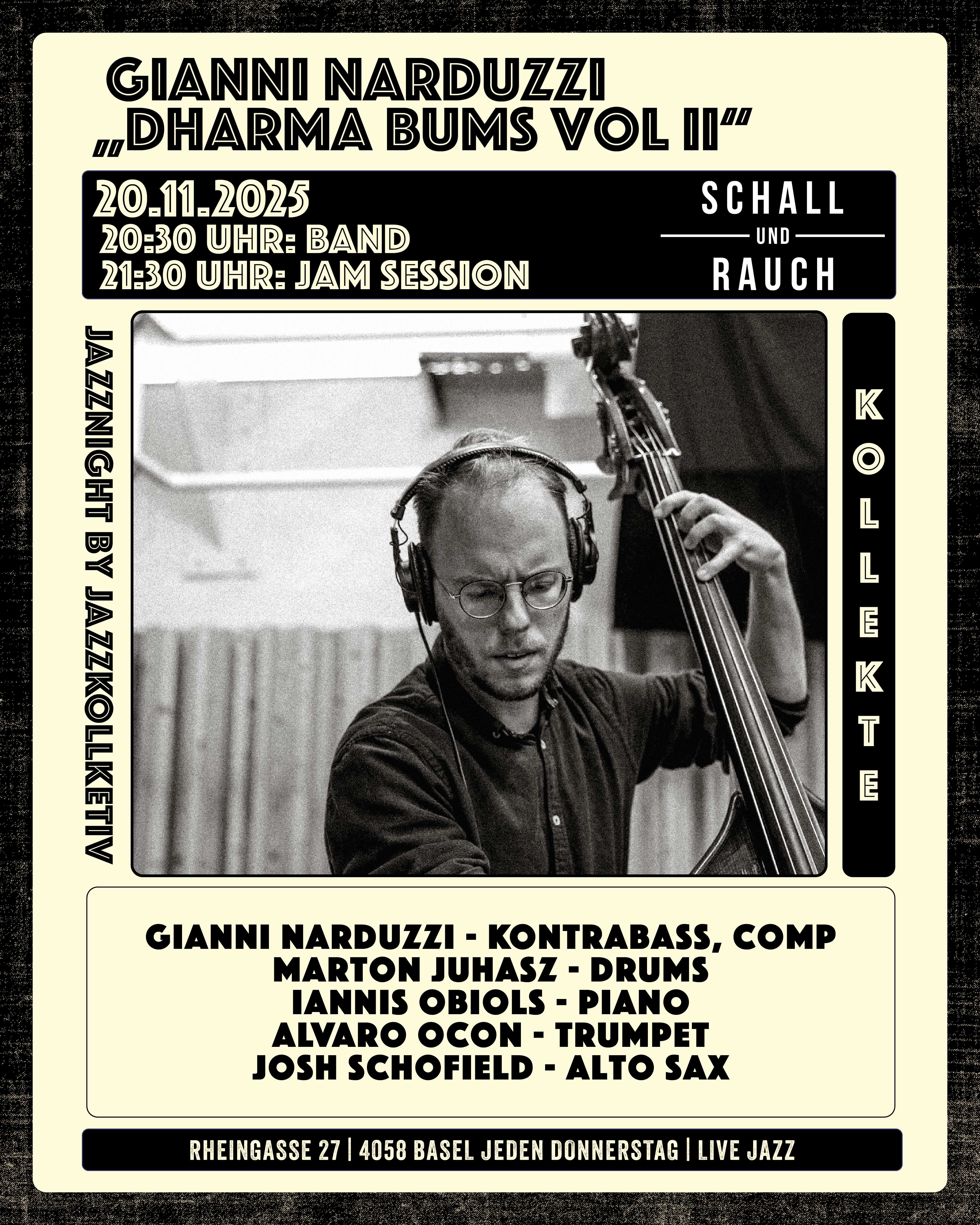 "Dharma Bums Vol. II" Is the title of the 3rd album as bandleader from the basel based double bassist and composer Gianni Narduzzi. focusing on original material, its music tries to capture the freedom and exiciting of this unique ensamble, rooted in the tradition of american jazz